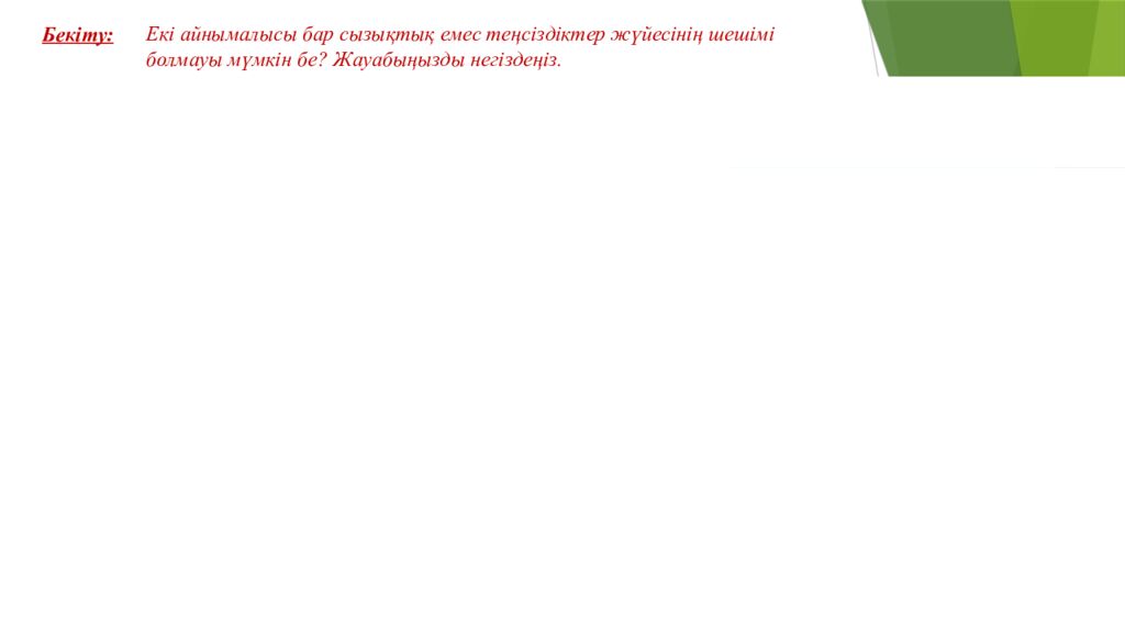 Екі айнымалысы бар сызықтық емес теңсіздіктер жүйесінің шешімі болмауы мүмкін бе? Жауабыңызды негіздеңіз. теңсіздіктер жүйесінің шешімі болатын нүктелер жиынын координаталық жазықтықта кескіндеңіз. Жауабы : шешімі жоқ Бекіту: