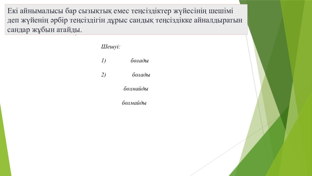 x және у айнымалылардың мәндері болатын мына сандар жұбының қайсысы теңсіздіктер жүйесінің шешімі болады: 1 ) Шешуі: болады болады болмайды болмайды Мысал: Екі айнымалысы бар сызықтық емес теңсіздіктер жүйесінің шешімі деп жүйенің әрбір теңсіздігін дұрыс сандық теңсіздікке айналдыратын сандар жұбын атайды.