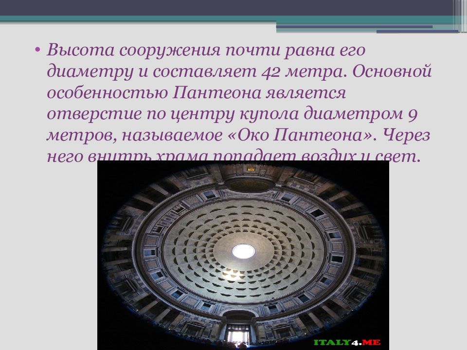 Высота сооружения почти равна его диаметру и составляет 42 метра. Основной особенностью Пантеона является отверстие по центру купола диаметром 9 метров, называемое «Око Пантеона». Через него внутрь храма попадает воздух и свет.