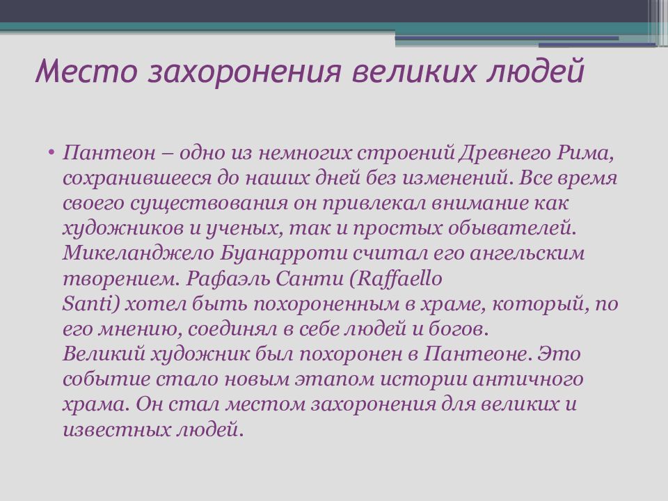 Пантеон – одно из немногих строений Древнего Рима, сохранившееся до наших дней без изменений. Все время своего существования он привлекал внимание как художников и ученых, так и простых обывателей. Микеланджело Буанарроти считал его ангельским творением. Рафаэль Санти ( Raffaello Santi ) хотел быть похороненным в храме, который, по его мнению, соединял в себе людей и богов. Великий художник был похоронен в Пантеоне. Это событие стало новым этапом истории античного храма. Он стал местом захоронения для великих и известных людей.