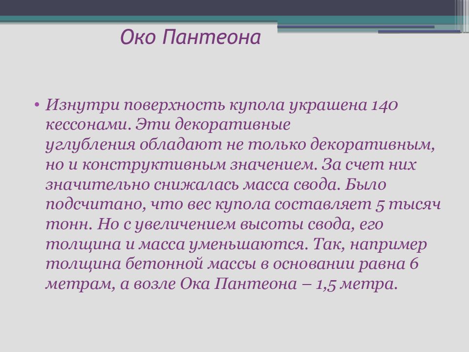 Изнутри поверхность купола украшена 140 кессонами. Эти декоративные углубления обладают не только декоративным, но и конструктивным значением. За счет них значительно снижалась масса свода. Было подсчитано, что вес купола составляет 5 тысяч тонн. Но с увеличением высоты свода, его толщина и масса уменьшаются. Так, например толщина бетонной массы в основании равна 6 метрам, а возле Ока Пантеона – 1,5 метра.