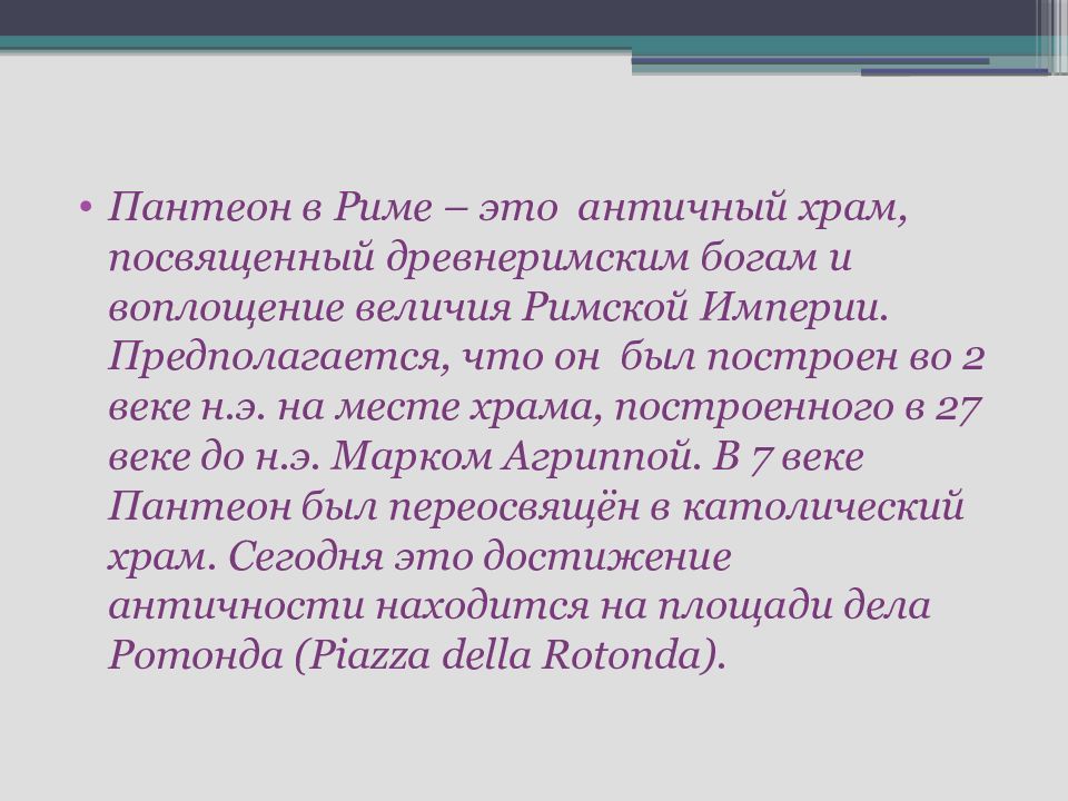Пантеон в Риме – это античный храм, посвященный древнеримским богам и воплощение величия Римской Империи. Предполагается, что он был построен во 2 веке н.э. на месте храма, построенного в 27 веке до н.э. Марком Агриппой. В 7 веке Пантеон был переосвящён в католический храм. Сегодня это достижение античности находится на площади дела Ротонда ( Piazza della Rotonda ).