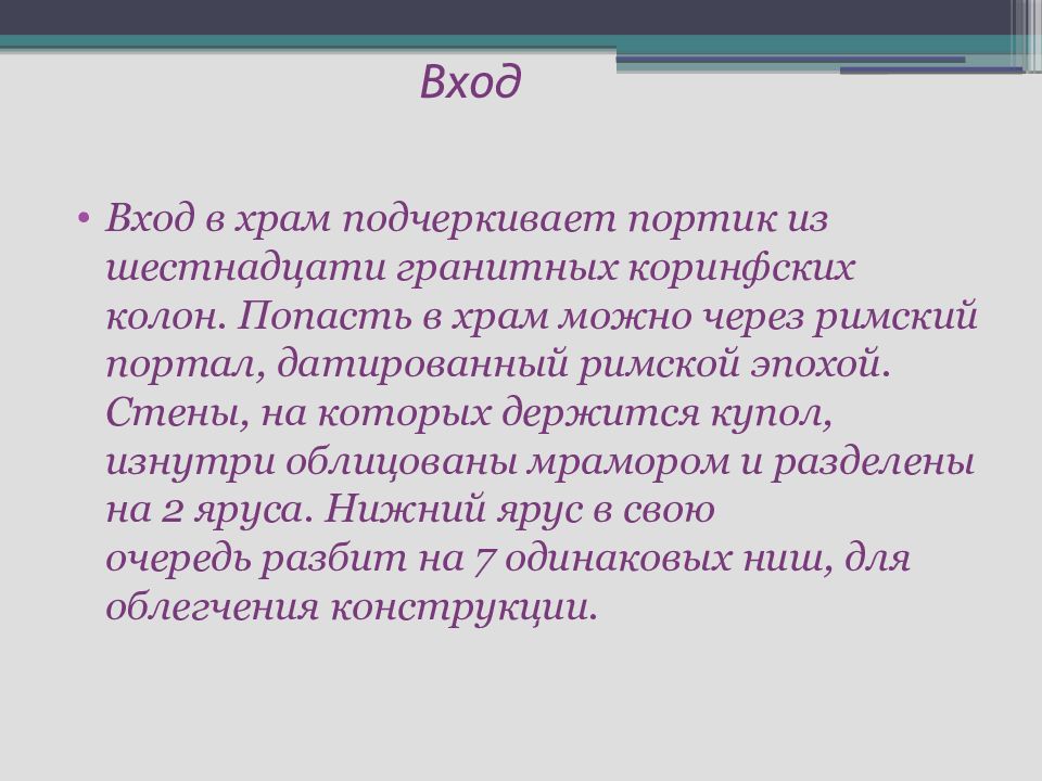 Вход в храм подчеркивает портик из шестнадцати гранитных коринфских колон. Попасть в храм можно через римский портал, датированный римской эпохой. Стены, на которых держится купол, изнутри облицованы мрамором и разделены на 2 яруса. Нижний ярус в свою очередь разбит на 7 одинаковых ниш, для облегчения конструкции.