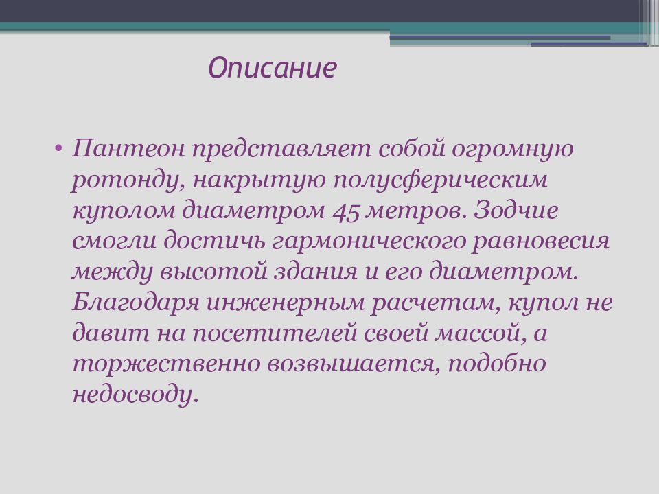 Пантеон представляет собой огромную ротонду, накрытую полусферическим куполом диаметром 45 метров. Зодчие смогли достичь гармонического равновесия между высотой здания и его диаметром. Благодаря инженерным расчетам, купол не давит на посетителей своей массой, а торжественно возвышается, подобно недосводу.
