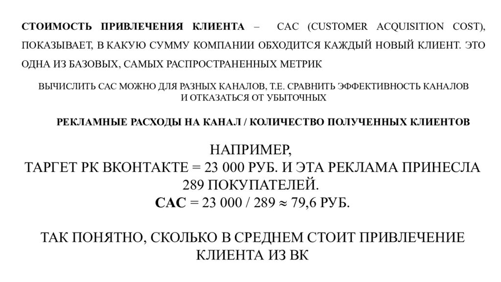 СТОИМОСТЬ ПРИВЛЕЧЕНИЯ КЛИЕНТА – CAC ( CUSTOMER ACQUISITION COST ), ПОКАЗЫВАЕТ, В КАКУЮ СУММУ КОМПАНИИ ОБХОДИТСЯ КАЖДЫЙ НОВЫЙ КЛИЕНТ. ЭТО ОДНА ИЗ БАЗОВЫХ, САМЫХ РАСПРОСТРАНЕННЫХ МЕТРИК ВЫЧИСЛИТЬ САС МОЖНО ДЛЯ РАЗНЫХ КАНАЛОВ, Т.Е. СРАВНИТЬ ЭФФЕКТИВНОСТЬ КАНАЛОВ И ОТКАЗАТЬСЯ ОТ УБЫТОЧНЫХ РЕКЛАМНЫЕ РАСХОДЫ НА КАНАЛ / КОЛИЧЕСТВО ПОЛУЧЕННЫХ КЛИЕНТОВ НАПРИМЕР, ТАРГЕТ РК ВКОНТАКТЕ = 23 000 РУБ. И ЭТА РЕКЛАМА ПРИНЕСЛА 289 ПОКУПАТЕЛЕЙ. CAC = 23 000 / 289 79,6 РУБ. ТАК ПОНЯТНО, СКОЛЬКО В СРЕДНЕМ СТОИТ ПРИВЛЕЧЕНИЕ КЛИЕНТА ИЗ ВК