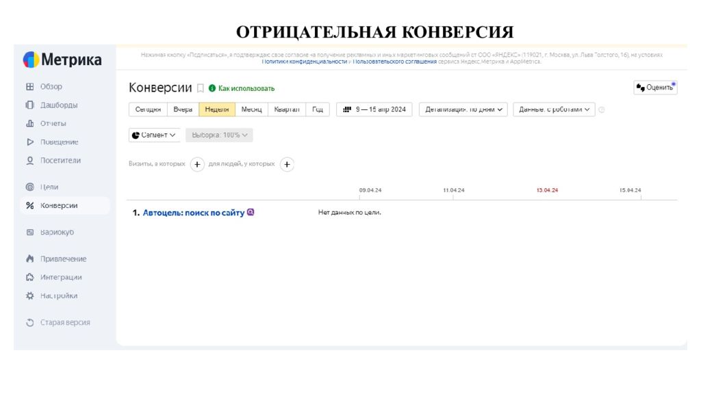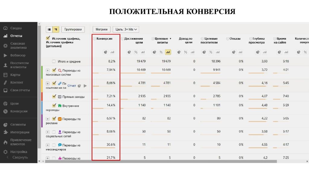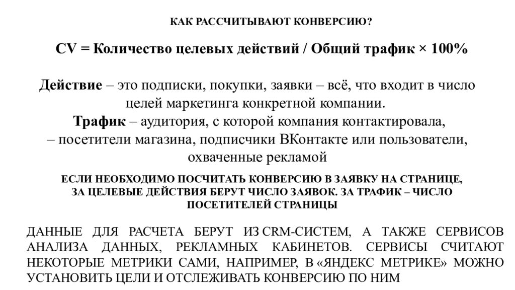 КАК РАССЧИТЫВАЮТ КОНВЕРСИЮ? CV = Количество целевых действий / Общий трафик × 100% Действие – это подписки, покупки, заявки – всё, что входит в число целей маркетинга конкретной компании. Трафик – аудитория, с которой компания контактировала, – посетители магазина, подписчики ВКонтакте или пользователи, охваченные рекламой ЕСЛИ НЕОБХОДИМО ПОСЧИТАТЬ КОНВЕРСИЮ В ЗАЯВКУ НА СТРАНИЦЕ, ЗА ЦЕЛЕВЫЕ ДЕЙСТВИЯ БЕРУТ ЧИСЛО ЗАЯВОК. ЗА ТРАФИК – ЧИСЛО ПОСЕТИТЕЛЕЙ СТРАНИЦЫ ДАННЫЕ ДЛЯ РАСЧЕТА БЕРУТ ИЗ CRM-СИСТЕМ, А ТАКЖЕ СЕРВИСОВ АНАЛИЗА ДАННЫХ, РЕКЛАМНЫХ КАБИНЕТОВ. СЕРВИСЫ СЧИТАЮТ НЕКОТОРЫЕ МЕТРИКИ САМИ, НАПРИМЕР, В «ЯНДЕКС МЕТРИКЕ» МОЖНО УСТАНОВИТЬ ЦЕЛИ И ОТСЛЕЖИВАТЬ КОНВЕРСИЮ ПО НИМ