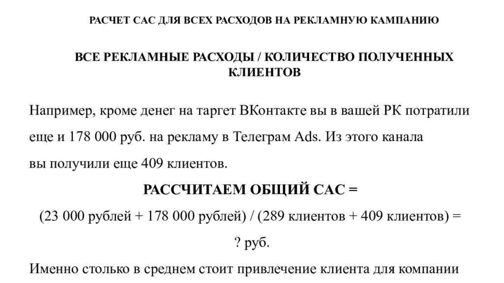 РАСЧЕТ CAC ДЛЯ ВСЕХ РАСХОДОВ НА РЕКЛАМНУЮ КАМПАНИЮ ВСЕ РЕКЛАМНЫЕ РАСХОДЫ / КОЛИЧЕСТВО ПОЛУЧЕННЫХ КЛИЕНТОВ Например, кроме денег на таргет ВКонтакте вы в вашей РК потратили еще и 178 000 руб. на рекламу в Телеграм Ads. Из этого канала вы получили еще 409 клиентов. РАССЧИТАЕМ ОБЩИЙ CAC = (23 000 рублей + 178 000 рублей) / (289 клиентов + 409 клиентов) = ? руб. Именно столько в среднем стоит привлечение клиента для компании