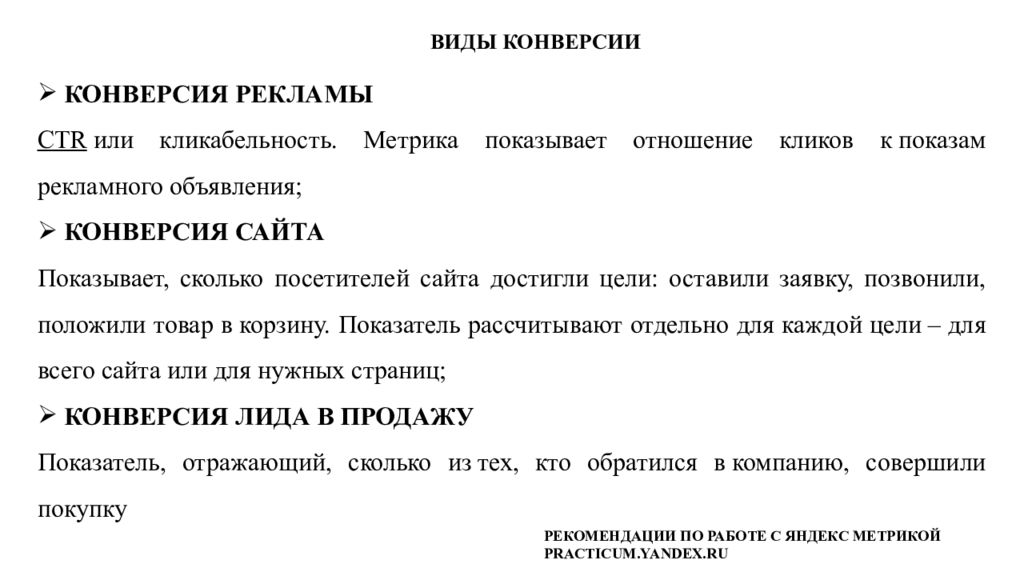ВИДЫ КОНВЕРСИИ КОНВЕРСИЯ РЕКЛАМЫ CTR или кликабельность. Метрика показывает отношение кликов к показам рекламного объявления; КОНВЕРСИЯ САЙТА Показывает, сколько посетителей сайта достигли цели: оставили заявку, позвонили, положили товар в корзину. Показатель рассчитывают отдельно для каждой цели – для всего сайта или для нужных страниц; КОНВЕРСИЯ ЛИДА В ПРОДАЖУ Показатель, отражающий, сколько из тех, кто обратился в компанию, совершили покупку РЕКОМЕНДАЦИИ ПО РАБОТЕ С ЯНДЕКС МЕТРИКОЙ PRACTICUM.YANDEX.RU