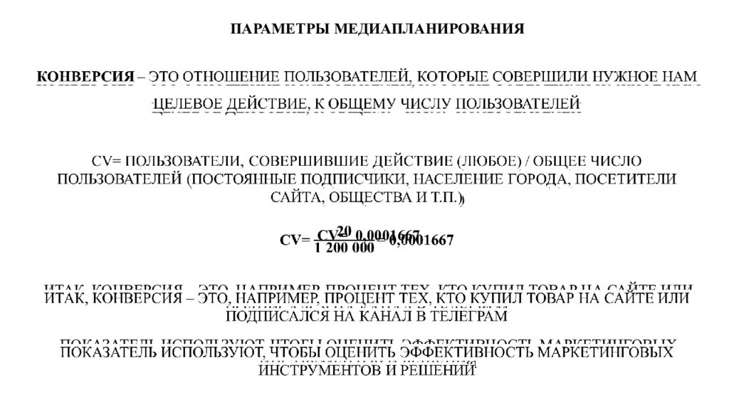 ПАРАМЕТРЫ МЕДИАПЛАНИРОВАНИЯ КОНВЕРСИЯ – ЭТО ОТНОШЕНИЕ ПОЛЬЗОВАТЕЛЕЙ, КОТОРЫЕ СОВЕРШИЛИ НУЖНОЕ НАМ ЦЕЛЕВОЕ ДЕЙСТВИЕ, К ОБЩЕМУ ЧИСЛУ ПОЛЬЗОВАТЕЛЕЙ CV = ПОЛЬЗОВАТЕЛИ, СОВЕРШИВШИЕ ДЕЙСТВИЕ (ЛЮБОЕ) / ОБЩЕЕ ЧИСЛО ПОЛЬЗОВАТЕЛЕЙ (ПОСТОЯННЫЕ ПОДПИСЧИКИ, НАСЕЛЕНИЕ ГОРОДА, ПОСЕТИТЕЛИ САЙТА, ОБЩЕСТВА И Т.П.) CV= 0,0001667 ИТАК, КОНВЕРСИЯ – ЭТО, НАПРИМЕР, ПРОЦЕНТ ТЕХ, КТО КУПИЛ ТОВАР НА САЙТЕ ИЛИ ПОДПИСАЛСЯ НА КАНАЛ В ТЕЛЕГРАМ ПОКАЗАТЕЛЬ ИСПОЛЬЗУЮТ, ЧТОБЫ ОЦЕНИТЬ ЭФФЕКТИВНОСТЬ МАРКЕТИНГОВЫХ ИНСТРУМЕНТОВ И РЕШЕНИЙ