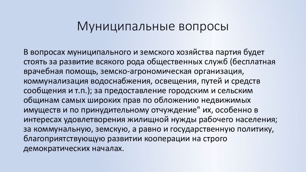 В вопросах муниципального и земского хозяйства партия будет стоять за развитие всякого рода общественных служб (бесплатная врачебная помощь, земско-агрономическая организация, коммунализация водоснабжения, освещения, путей и средств сообщения и т.п.); за предоставление городским и сельским общинам самых широких прав по обложению недвижимых имуществ и по принудительному отчуждение" их, особенно в интересах удовлетворения жилищной нужды рабочего населения; за коммунальную, земскую, а равно и государственную политику, благоприятствующую развитии кооперации на строго демократических началах.