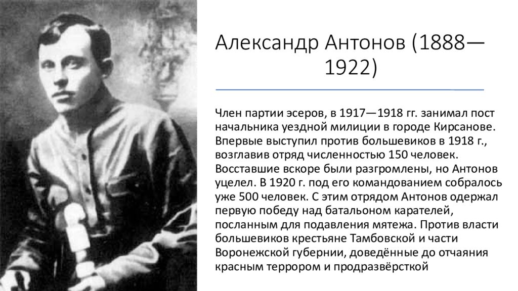 Член партии эсеров, в 1917—1918 гг. занимал пост начальника уездной милиции в городе Кирсанове. Впервые выступил против большевиков в 1918 г., возглавив отряд численностью 150 человек. Восставшие вскоре были разгромлены, но Антонов уцелел. В 1920 г. под его командованием собралось уже 500 человек. С этим отрядом Антонов одержал первую победу над батальоном карателей, посланным для подавления мятежа. Против власти большевиков крестьяне Тамбовской и части Воронежской губернии, доведённые до отчаяния красным террором и продразвёрсткой