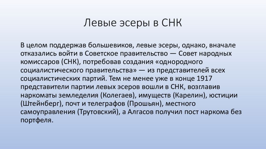 В целом поддержав большевиков, левые эсеры, однако, вначале отказались войти в Советское правительство — Совет народных комиссаров (СНК), потребовав создания «однородного социалистического правительства» — из представителей всех социалистических партий. Тем не менее уже в конце 1917 представители партии левых эсеров вошли в СНК, возглавив наркоматы земледелия (Колегаев), имуществ (Карелин), юстиции (Штейнберг), почт и телеграфов (Прошьян), местного самоуправления (Трутовский), а Алгасов получил пост наркома без портфеля.