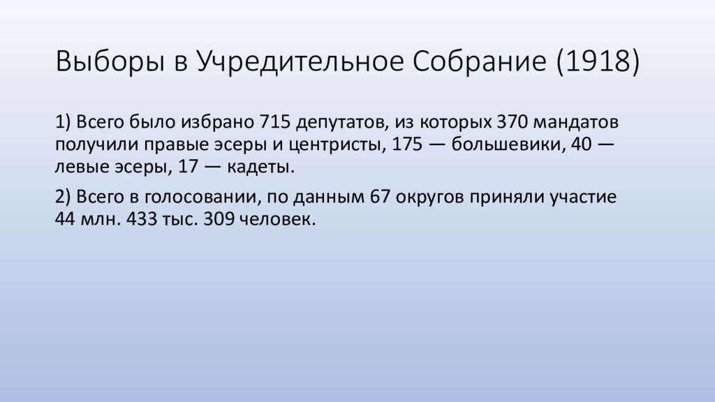 1) Всего было избрано 715 депутатов, из которых 370 мандатов получили правые эсеры и центристы, 175 — большевики, 40 — левые эсеры, 17 — кадеты. 2) Всего в голосовании, по данным 67 округов приняли участие 44 млн. 433 тыс. 309 человек.
