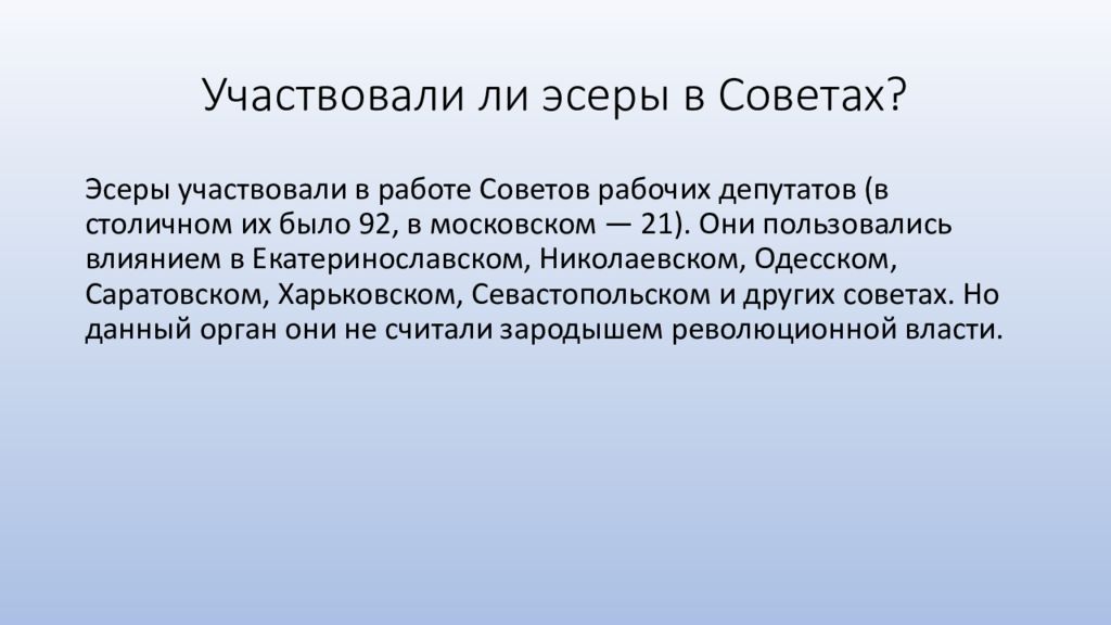 Эсеры участвовали в работе Советов рабочих депутатов (в столичном их было 92, в московском — 21). Они пользовались влиянием в Екатеринославском, Николаевском, Одесском, Саратовском, Харьковском, Севастопольском и других советах. Но данный орган они не считали зародышем революционной власти.
