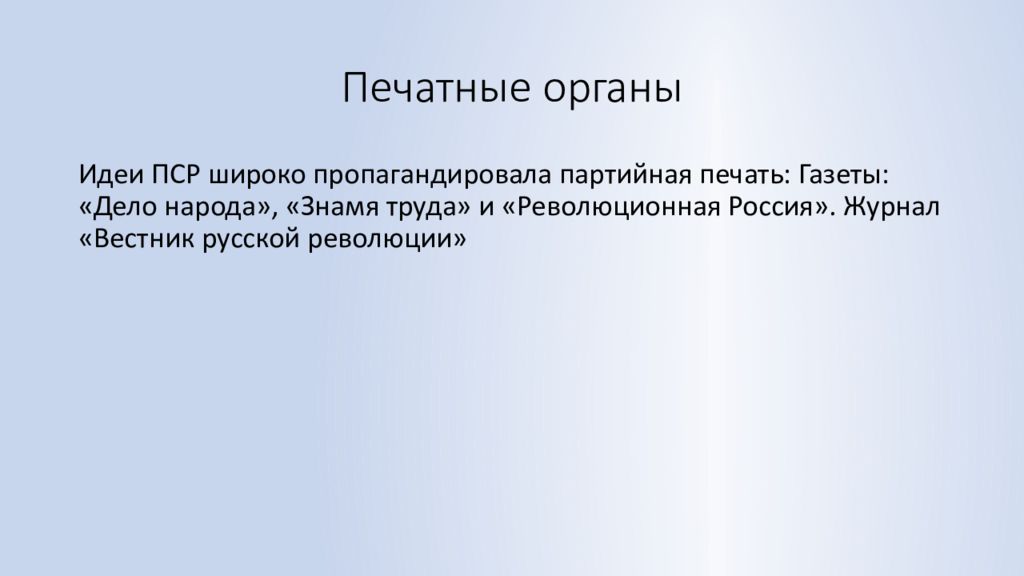 Идеи ПСР широко пропагандировала партийная печать: Газеты: «Дело народа», «Знамя труда» и «Революционная Россия». Журнал «Вестник русской революции»