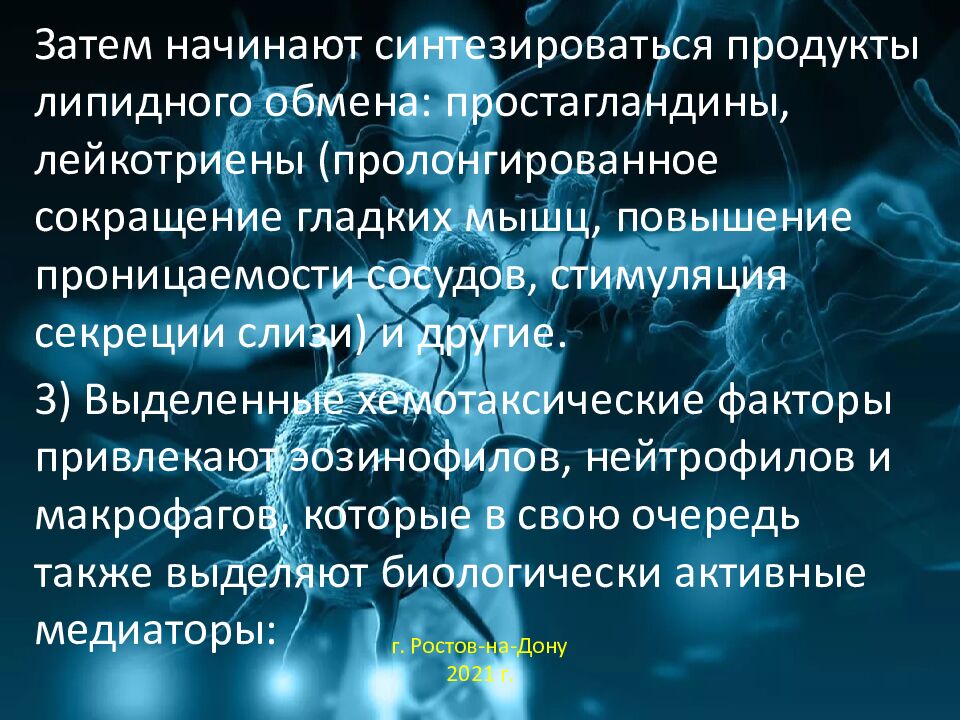 Затем начинают синтезироваться продукты липидного обмена: простагландины, лейкотриены (пролонгированное сокращение гладких мышц, повышение проницаемости сосудов, стимуляция секреции слизи) и другие. 3) Выделенные хемотаксические факторы привлекают эозинофилов, нейтрофилов и макрофагов, которые в свою очередь также выделяют биологически активные медиаторы: г. Ростов-на-Дону 2021 г.