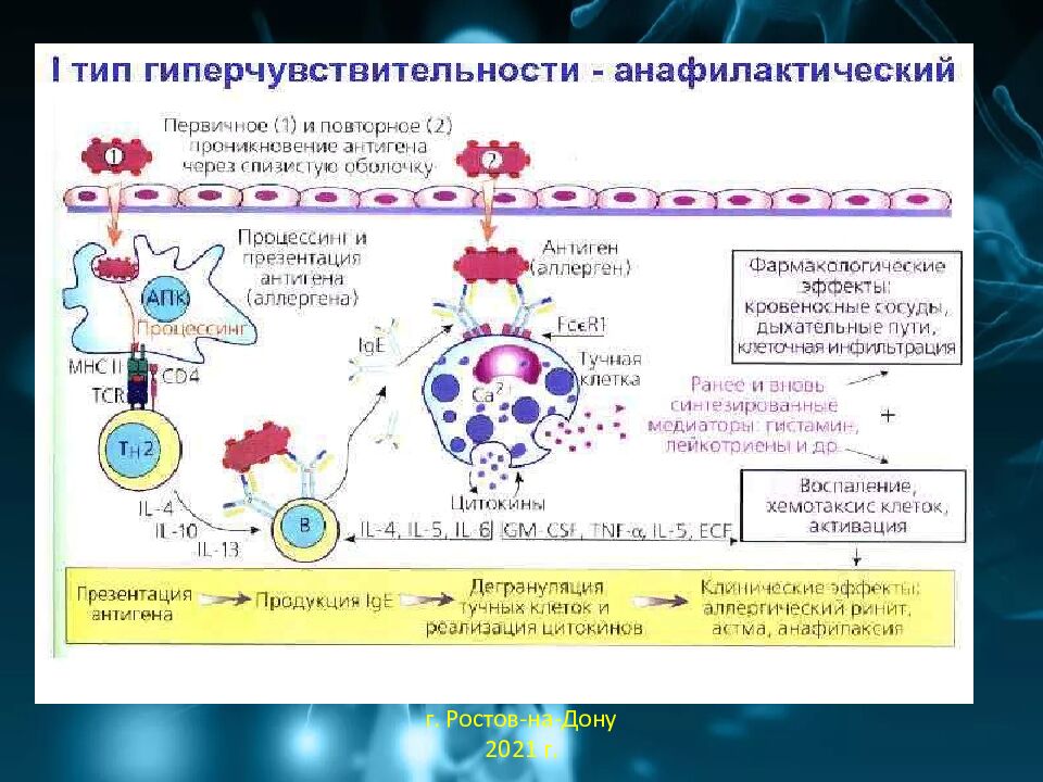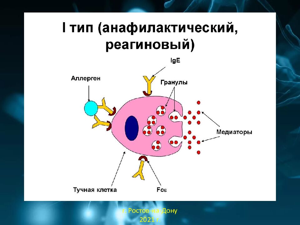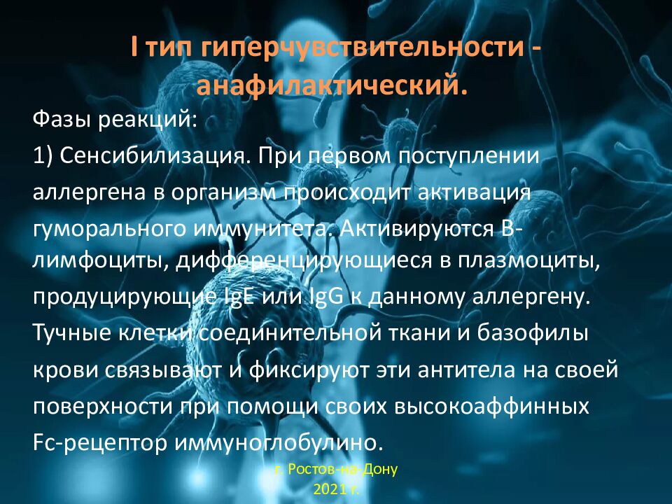 Фазы реакций : 1) Сенсибилизация. При первом поступлении аллергена в организм происходит активация гуморального иммунитета. Активируются В - лимфоциты, дифференцирующиеся в плазмоциты, продуцирующие IgE или IgG к данному аллергену. Тучные клетки соединительной ткани и базофилы крови связывают и фиксируют эти антитела на своей поверхности при помощи своих высокоаффинных Fc - рецептор иммуноглобулино. г. Ростов-на-Дону 2021 г.