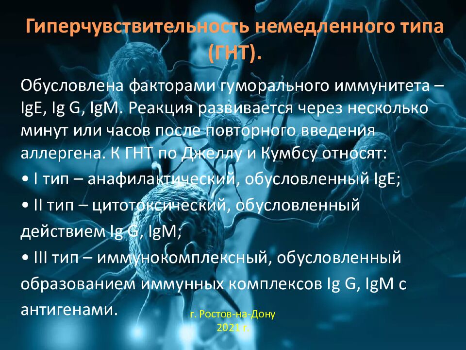 Обусловлена факторами гуморального иммунитета – IgЕ, Ig G, IgМ. Реакция развивается через несколько минут или часов после повторного введения аллергена. К ГНТ по Джеллу и Кумбсу относят: • I тип – анафилактический, обусловленный IgE; • II тип – цитотоксический, обусловленный действием Ig G, IgМ; • III тип – иммунокомплексный, обусловленный образованием иммунных комплексов Ig G, IgМ с антигенами. г. Ростов-на-Дону 2021 г.