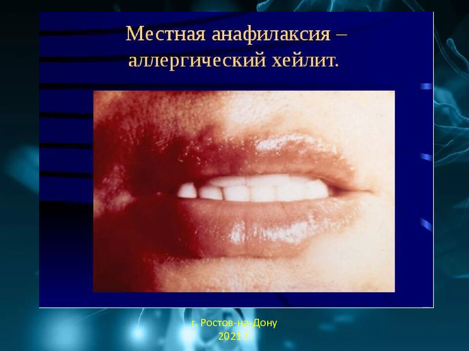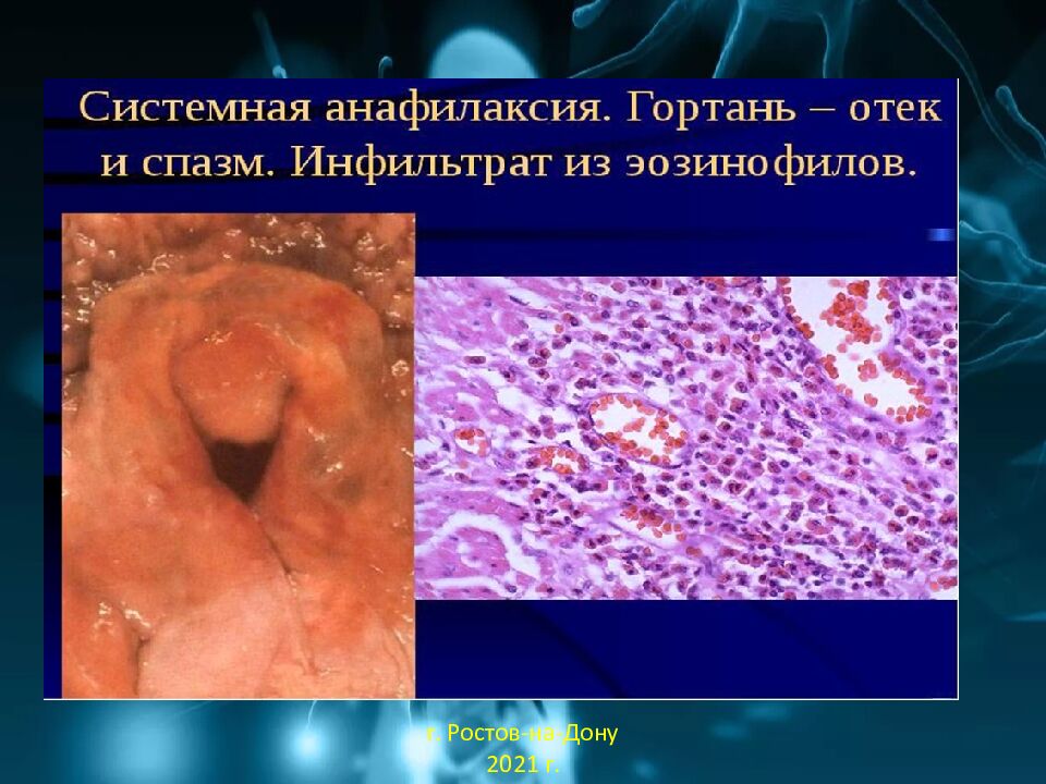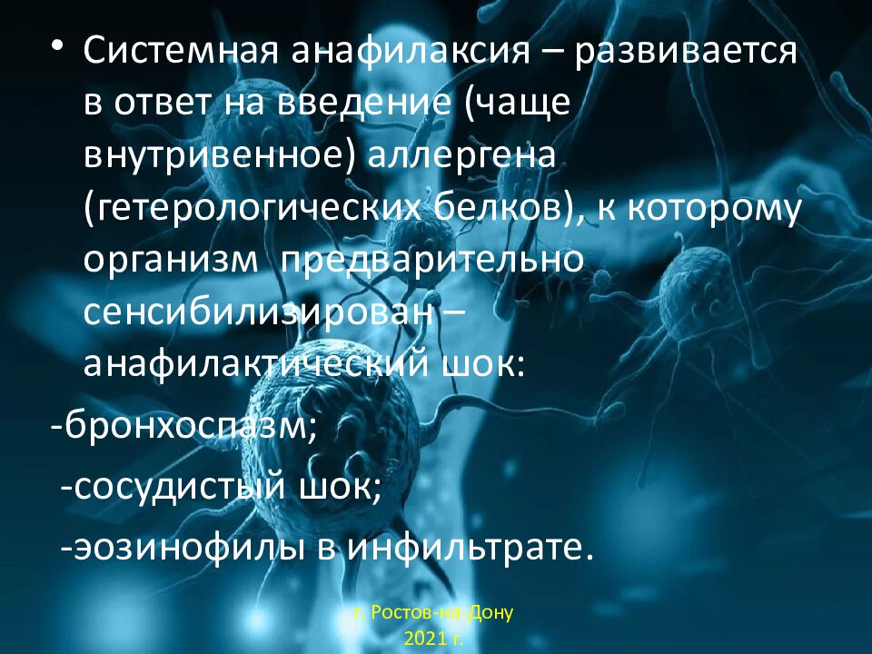 Системная анафилаксия – развивается в ответ на введение (чаще внутривенное) аллергена (гетерологических белков), к которому организм предварительно сенсибилизирован – анафилактический шок: - бронхоспазм ; -сосудистый шок ; -эозинофилы в инфильтрате. г. Ростов-на-Дону 2021 г.