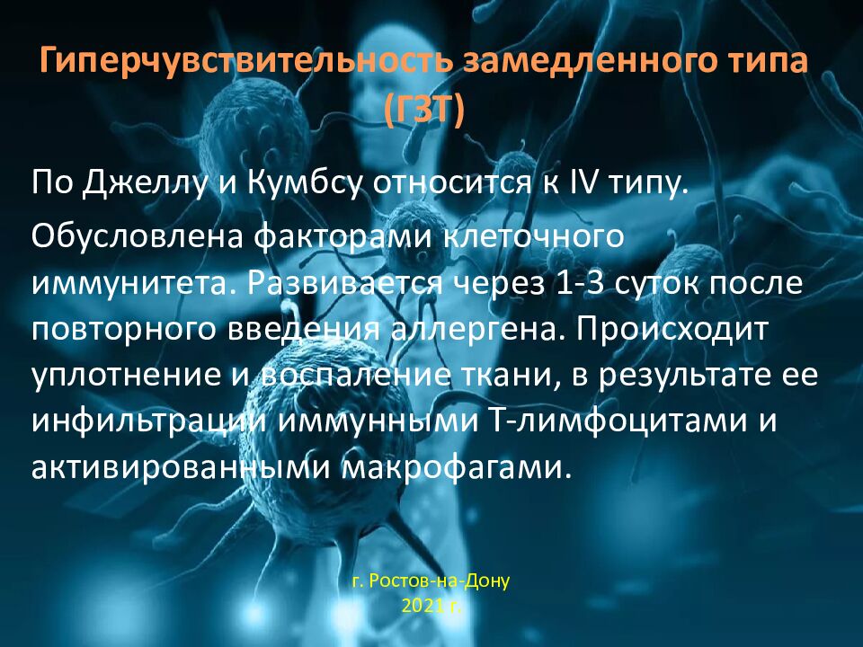 По Джеллу и Кумбсу относится к IV типу. Обусловлена факторами клеточного иммунитета. Развивается через 1-3 суток после повторного введения аллергена. Происходит уплотнение и воспаление ткани, в результате ее инфильтрации иммунными Т-лимфоцитами и активированными макрофагами. г. Ростов-на-Дону 2021 г.