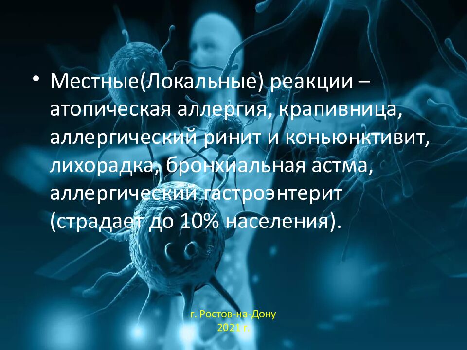 Местные ( Локальные ) реакции – атопическая аллергия, крапивница, аллергический ринит и коньюнктивит, лихорадка, бронхиальная астма, аллергический гастроэнтерит (страдает до 10% населения). г. Ростов-на-Дону 2021 г.