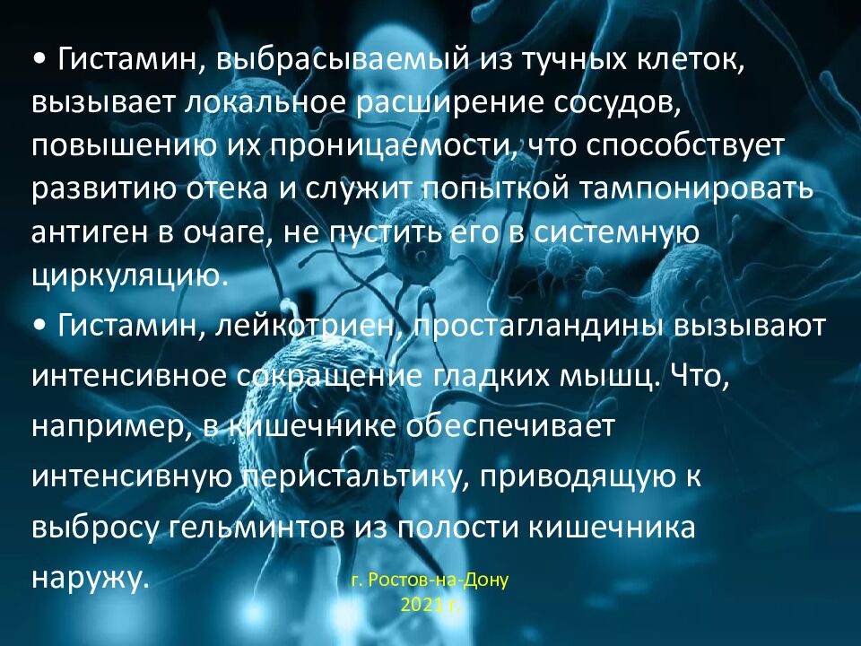 • Гистамин, выбрасываемый из тучных клеток, вызывает локальное расширение сосудов, повышению их проницаемости, что способствует развитию отека и служит попыткой тампонировать антиген в очаге, не пустить его в системную циркуляцию. • Гистамин, лейкотриен, простагландины вызывают интенсивное сокращение гладких мышц. Что, например, в кишечнике обеспечивает интенсивную перистальтику, приводящую к выбросу гельминтов из полости кишечника наружу. г. Ростов-на-Дону 2021 г.