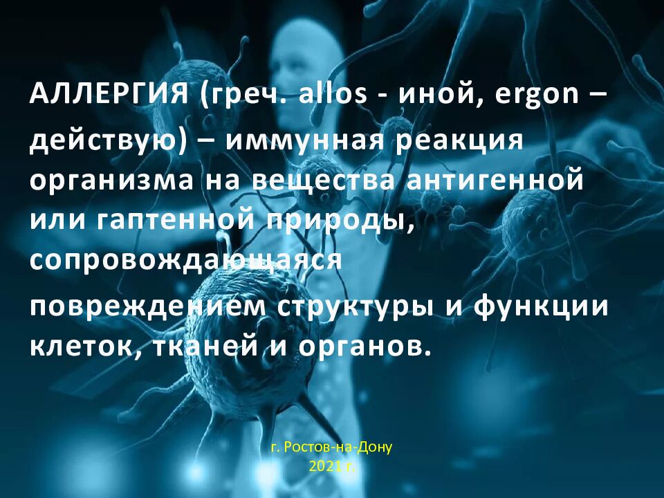 АЛЛЕРГИЯ (греч. allos - иной, ergon – действую) – иммунная реакция организма на вещества антигенной или гаптенной природы, сопровождающаяся повреждением структуры и функции клеток, тканей и органов. г. Ростов-на-Дону 2021 г.