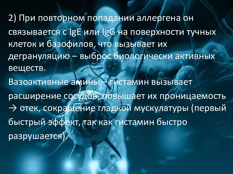 2) При повторном попадании аллергена он связывается с IgE или IgG на поверхности тучных клеток и базофилов, что вызывает их дегрануляцию – выброс биологически активных веществ. Вазоактивные амины – гистамин вызывает расширение сосудов, повышает их проницаемость → отек, сокращение гладкой мускулатуры (первый быстрый эффект, так как гистамин быстро разрушается).