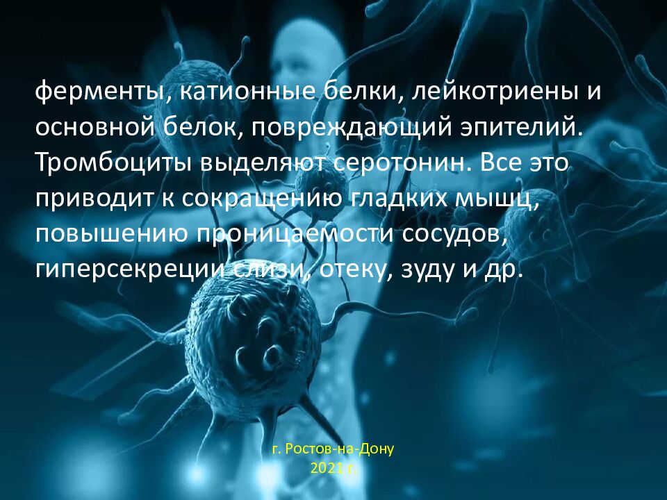 ферменты, катионные белки, лейкотриены и основной белок, повреждающий эпителий. Тромбоциты выделяют серотонин. Все это приводит к сокращению гладких мышц, повышению проницаемости сосудов, гиперсекреции слизи, отеку, зуду и др. г. Ростов-на-Дону 2021 г.