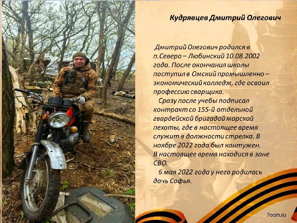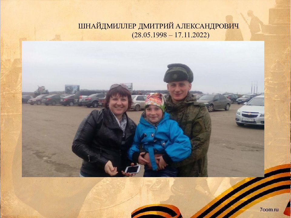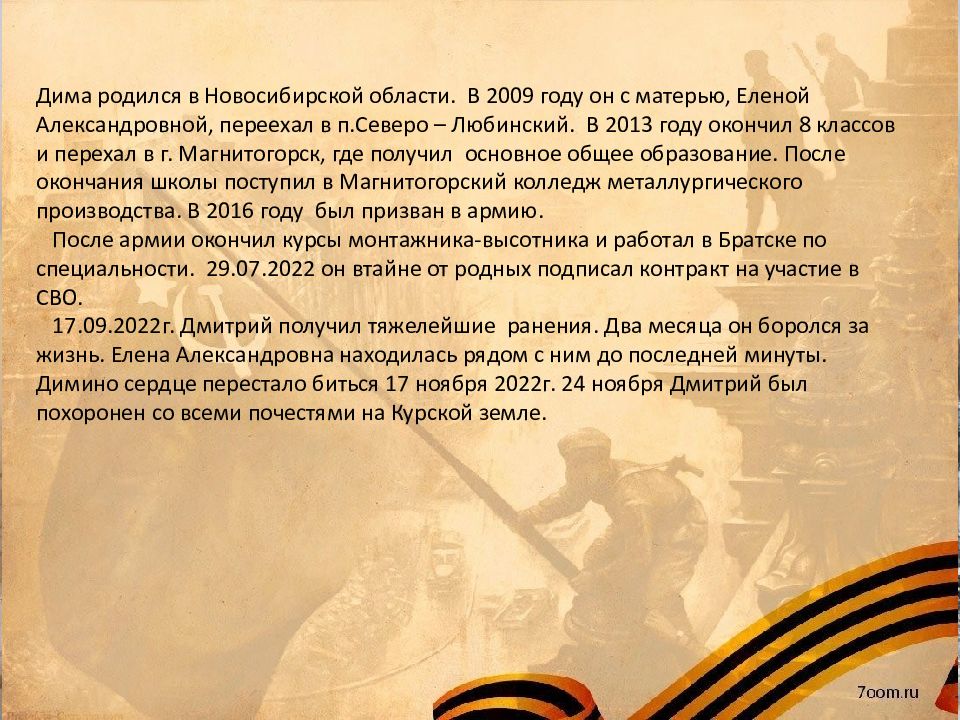 Дима родился в Новосибирской области. В 2009 году он с матерью, Еленой Александровной, переехал в п.Северо – Любинский. В 2013 году окончил 8 классов и перехал в г. Магнитогорск, где получил основное общее образование. После окончания школы поступил в Магнитогорский колледж металлургического производства. В 2016 году был призван в армию. После армии окончил курсы монтажника-высотника и работал в Братске по специальности. 29.07.2022 он втайне от родных подписал контракт на участие в СВО. 17.09.2022г. Дмитрий получил тяжелейшие ранения. Два месяца он боролся за жизнь. Елена Александровна находилась рядом с ним до последней минуты. Димино сердце перестало биться 17 ноября 2022г. 24 ноября Дмитрий был похоронен со всеми почестями на Курской земле.
