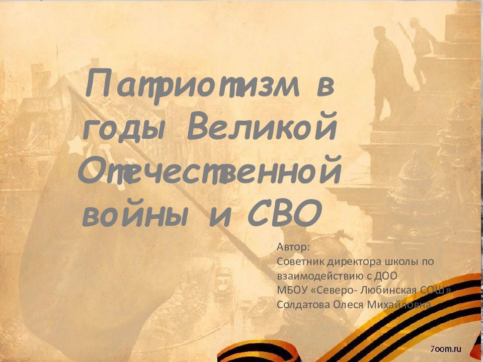Патриотизм в годы Великой Отечественной войны и СВО Автор: Советник директора школы по взаимодействию с ДОО МБОУ «Северо- Любинская СОШ» Солдатова Олеся Михайловна