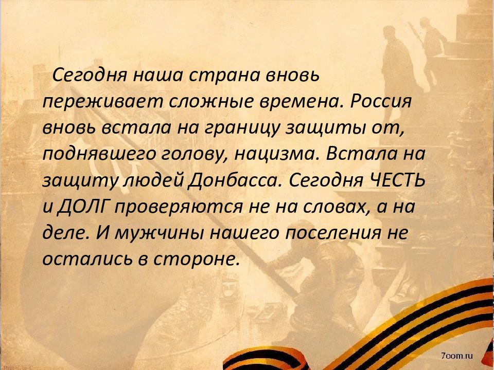Сегодня наша страна вновь переживает сложные времена. Россия вновь встала на границу защиты от, поднявшего голову, нацизма. Встала на защиту людей Донбасса. Сегодня ЧЕСТЬ и ДОЛГ проверяются не на словах, а на деле. И мужчины нашего поселения не остались в стороне.