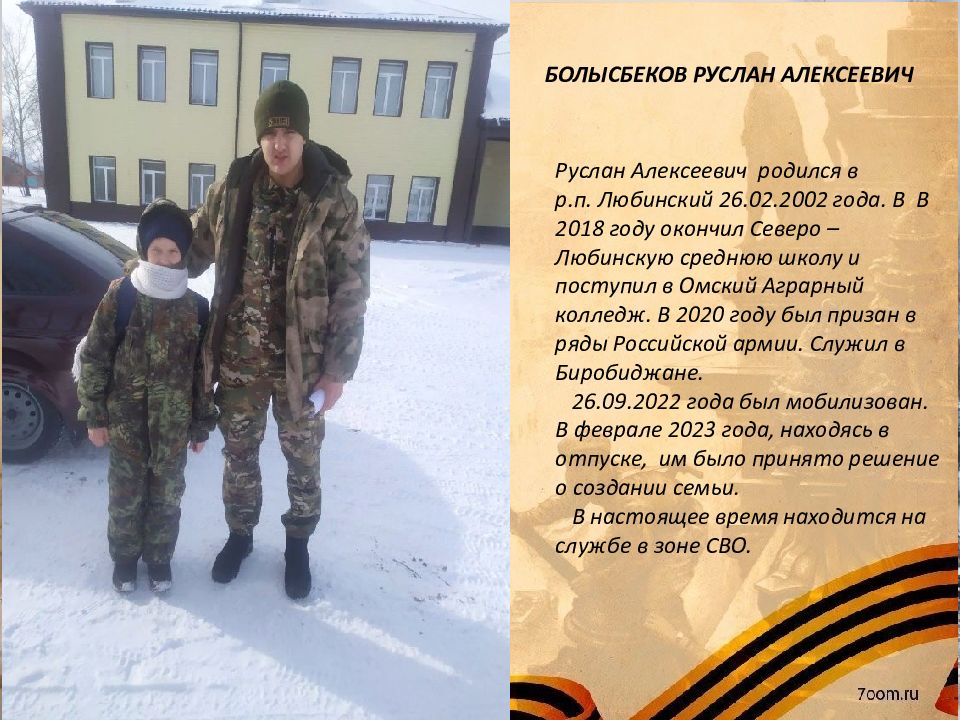 БОЛЫСБЕКОВ РУСЛАН АЛЕКСЕЕВИЧ Руслан Алексеевич родился в р.п. Любинский 26.02.2002 года. В В 2018 году окончил Северо – Любинскую среднюю школу и поступил в Омский Аграрный колледж. В 2020 году был призан в ряды Российской армии. Служил в Биробиджане. 26.09.2022 года был мобилизован. В феврале 2023 года, находясь в отпуске, им было принято решение о создании семьи. В настоящее время находится на службе в зоне СВО.