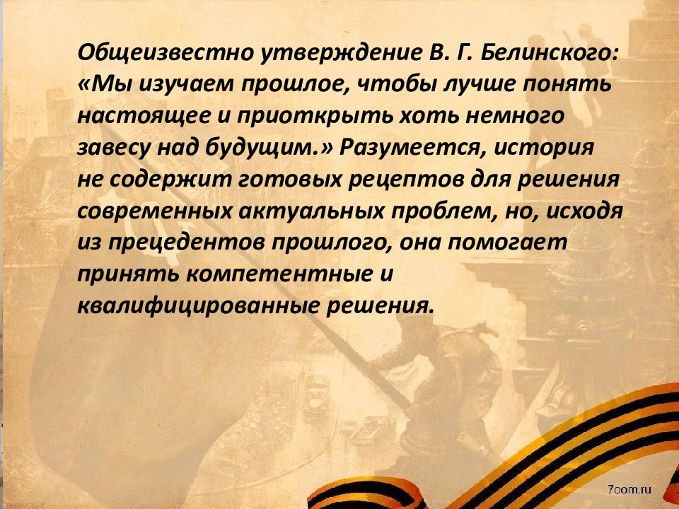 Общеизвестно утверждение В. Г. Белинского: «Мы изучаем прошлое, чтобы лучше понять настоящее и приоткрыть хоть немного завесу над будущим.» Разумеется, история не содержит готовых рецептов для решения современных актуальных проблем, но, исходя из прецедентов прошлого, она помогает принять компетентные и квалифицированные решения.