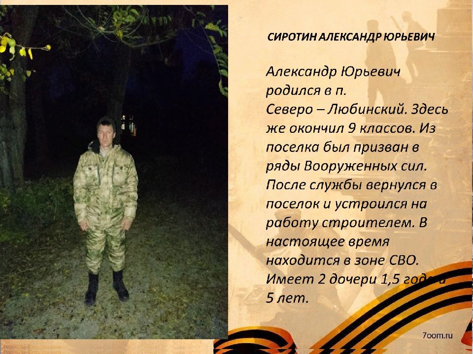 СИРОТИН АЛЕКСАНДР ЮРЬЕВИЧ Александр Юрьевич родился в п. Северо – Любинский. Здесь же окончил 9 классов. До мобилизации работал строителем.