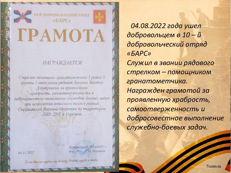 04.08.2022 года ушел добровольцем в 10 – й добровольческий отряд «БАРС» Служил в звании рядового стрелком – помощником гранатометчика. Награжден грамотой за проявленную храбрость, самоотверженность и добросовестное выполнение служебно-боевых задач.