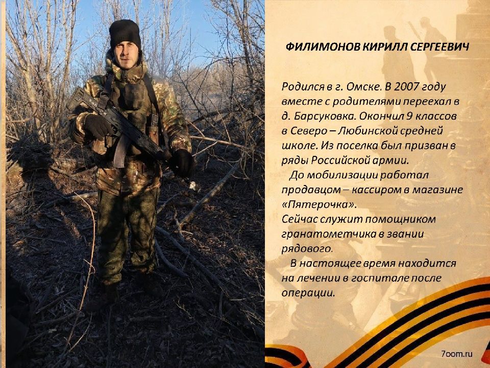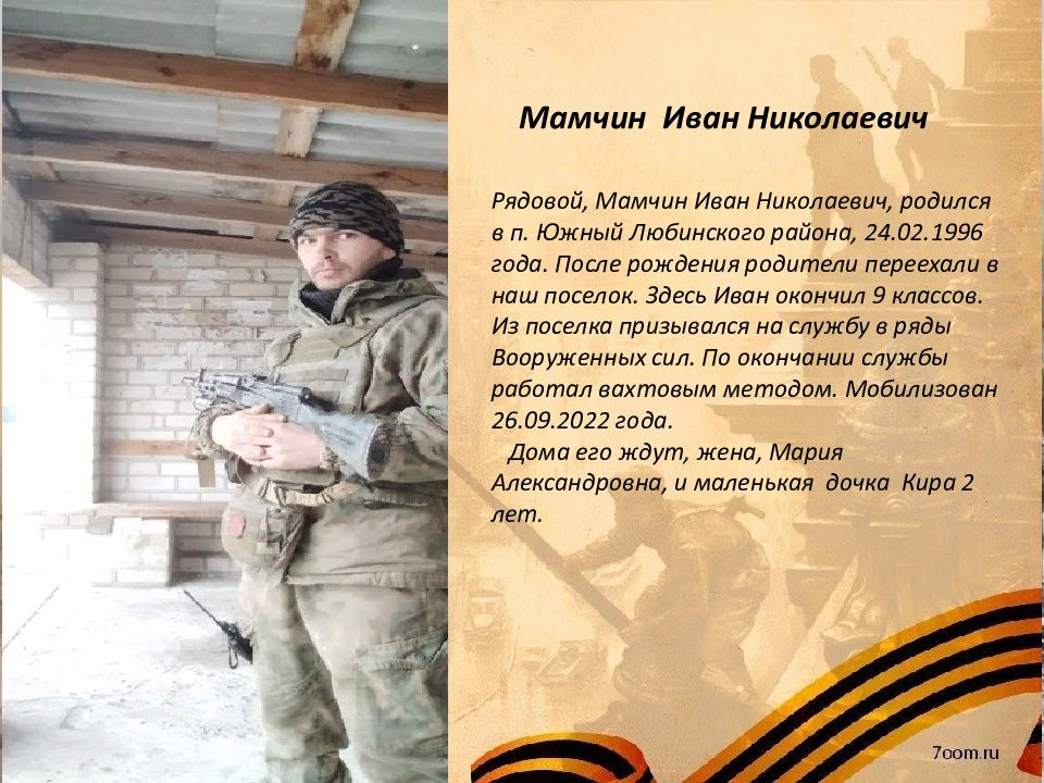 Мамчин Иван Николаевич Рядовой, Мамчин Иван Николаевич, родился в п. Южный Любинского района, 24.02.1996 года. После рождения родители переехали в наш поселок. Здесь Иван окончил 9 классов. Из поселка призывался на службу в ряды Вооруженных сил. По окончании службы работал вахтовым методом. Мобилизован 26.09.2022 года. Дома его ждут, жена, Мария Александровна, и маленькая дочка Кира 2 лет.