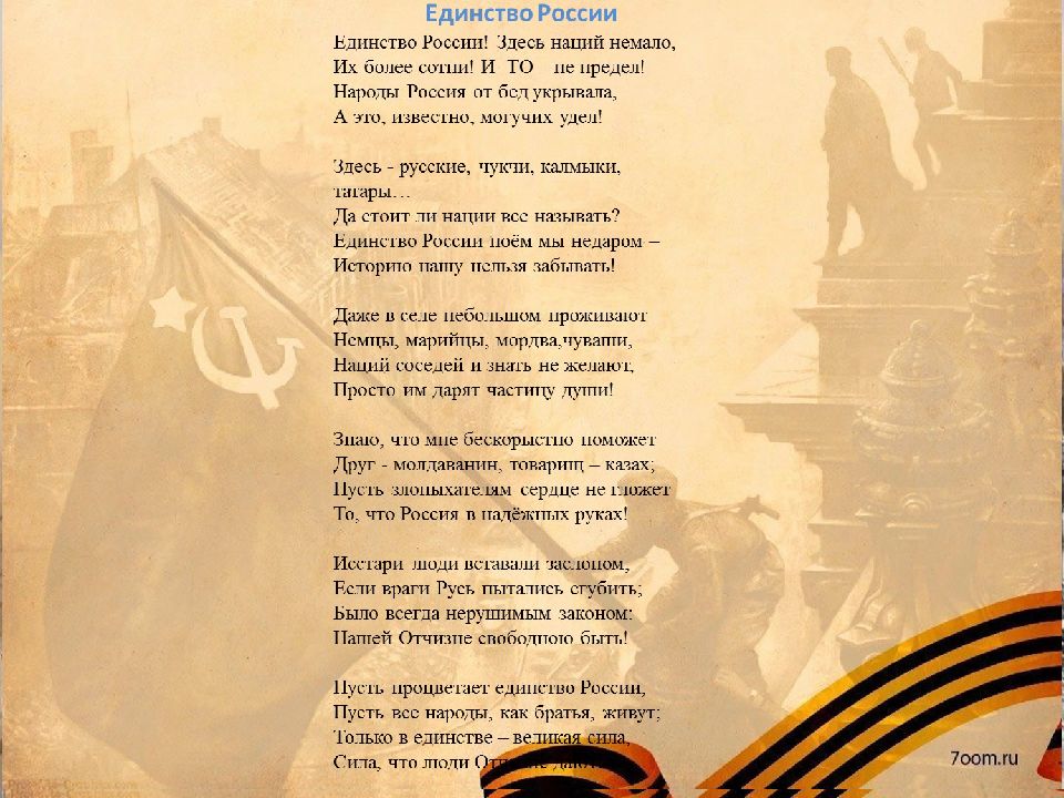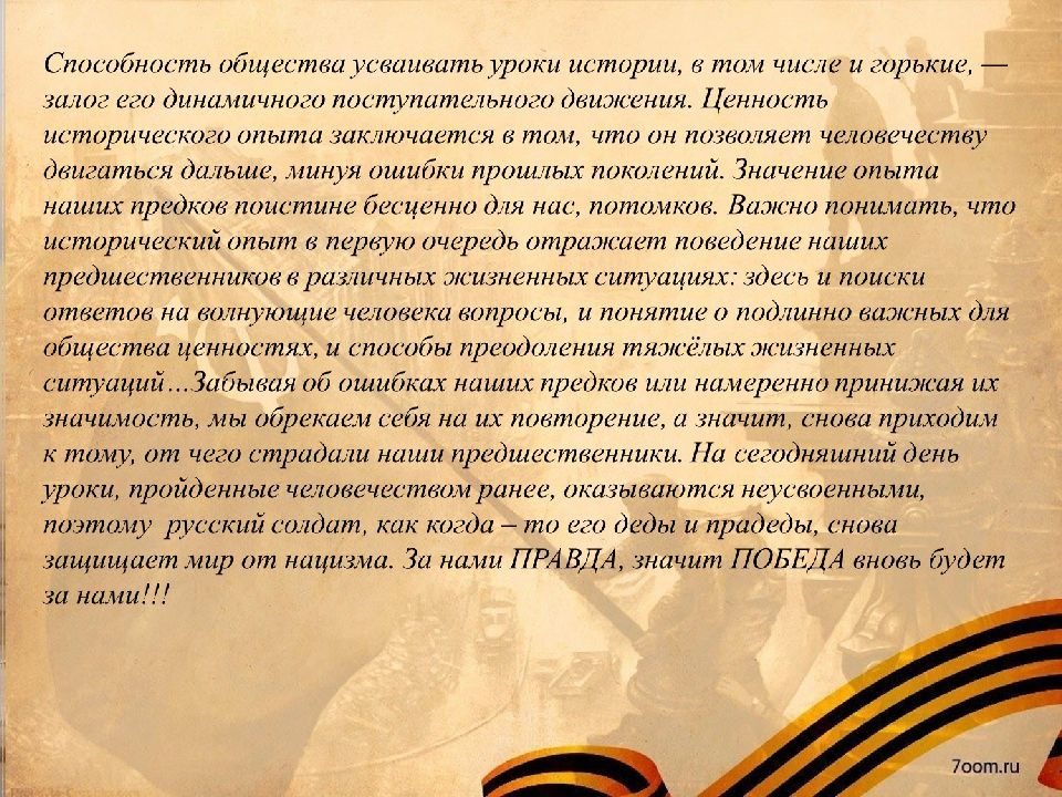 Способность общества усваивать уроки истории, в том числе и горькие, — залог его динамичного поступательного движения. Ценность исторического опыта заключается в том, что он позволяет человечеству двигаться дальше, минуя ошибки прошлых поколений. Значение опыта наших предков поистине бесценно для нас, потомков. Важно понимать, что исторический опыт в первую очередь отражает поведение наших предшественников в различных жизненных ситуациях: здесь и поиски ответов на волнующие человека вопросы, и понятие о подлинно важных для общества ценностях, и способы преодоления тяжёлых жизненных ситуаций… З абывая об ошибках наших предков или намеренно принижая их значимость, мы обрекаем себя на их повторение, а значит, снова приходим к тому, от чего страдали наши предшественники. На сегодняшний день уроки, пройденные человечеством ранее, оказываются неусвоенными. Н аша страна вновь переживает сложные времена, так как встала на границу защиты от, поднявшего голову, нацизма. Сегодня ЧЕСТЬ и ДОЛГ проверяются не на словах, а на деле. Но наш народ не сомневается в том, что «враг будет разбит, ПОБЕДА будет за нами!»