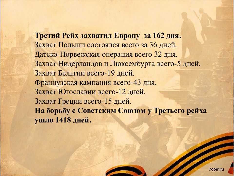 Третий Рейх захватил Европу за 162 дня. Захват Польши состоялся всего за 36 дней. Датско-Норвежская операция всего 32 дня. Захват Нидерландов и Люксембурга всего-5 дней. Захват Бельгии всего-19 дней. Французская кампания всего-43 дня. Захват Югославии всего-12 дней. Захват Греции всего-15 дней. На борьбу с Советским Союзом у Третьего рейха ушло 1418 дней.