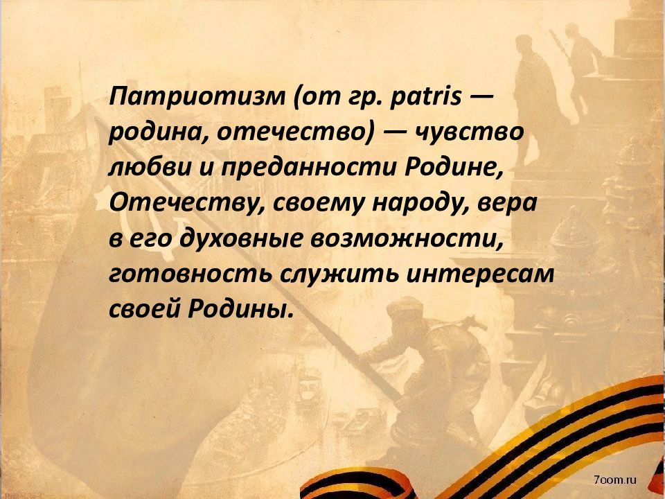 Патриотизм (от гр. patris — родина, отечество) — чувство любви и преданности Родине, Отечеству, своему народу, вера в его духовные возможности, готовность служить интересам своей Родины.
