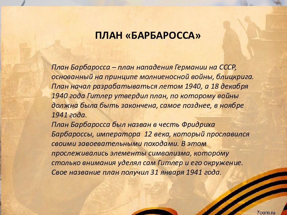 ПЛАН «БАРБАРОССА» План Барбаросса – план нападения Германии на СССР, основанный на принципе молниеносной войны, блицкрига. План начал разрабатываться летом 1940, а 18 декабря 1940 года Гитлер утвердил план, по которому войны должна была быть закончена, самое позднее, в ноябре 1941 года. План Барбаросса был назван в честь Фридриха Барбароссы, императора 12 века, который прославился своими завоевательными походами. В этом прослеживались элементы символизма, которому столько внимания уделял сам Гитлер и его окружение. Свое название план получил 31 января 1941 года.