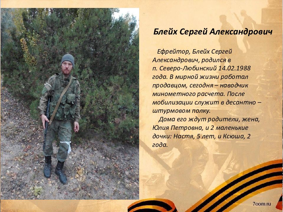 Блейх Сергей Александрович Ефрейтор, Блейх Сергей Александрович, родился в п. Северо-Любинский 14.02.1988 года. В мирной жизни работал продавцом, сегодня – наводчик минометного расчета. После мобилизации служит в десантно – штурмовом полку. Дома его ждут родители, жена, Юлия Петровна, и 2 маленькие дочки: Настя, 5 лет, и Ксюша, 2 года.