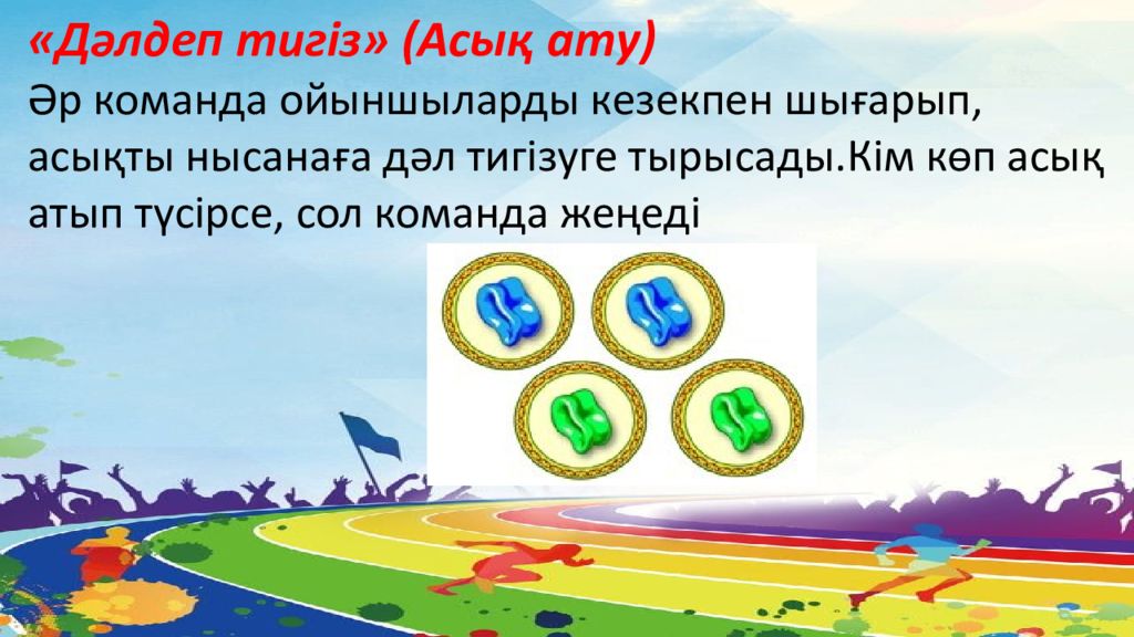 « Дәлдеп тигіз » ( Асық ату) Әр команда ойыншыларды кезекпен шығарып, асықты нысанаға дәл тигізуге тырысады.Кім көп асық атып түсірсе, сол команда жеңеді