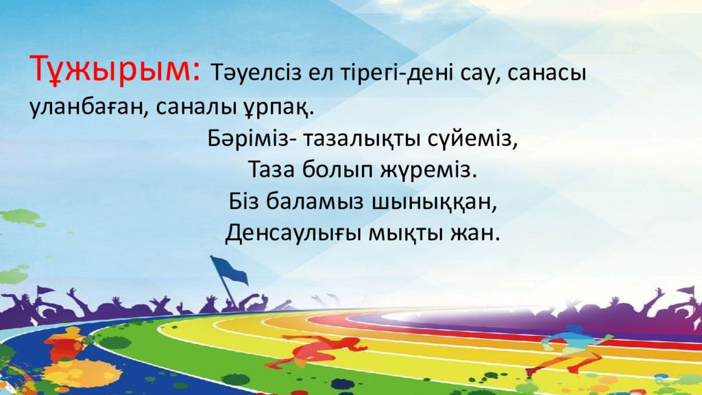 Тұжырым : Тәуелсіз ел тірегі-дені сау, санасы уланбаған, саналы ұрпақ. Бәріміз - тазалықты сүйеміз, Таза болып жүреміз. Біз баламыз шыныққан, Денсаулығы мықты жан.