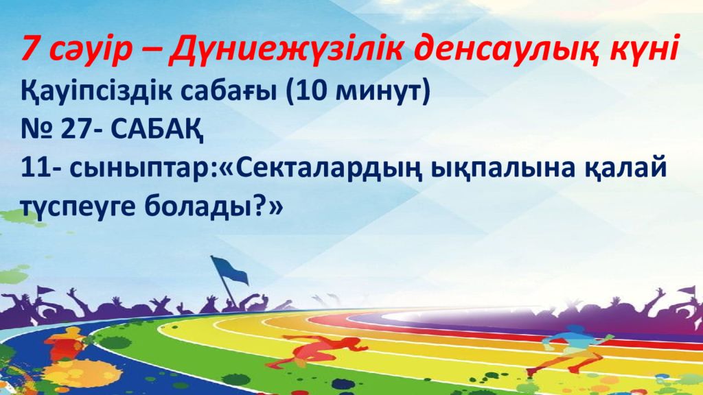 7 сәуір – Дүниежүзілік денсаулық күні Қауіпсіздік сабағы (10 минут) № 27- САБАҚ 11- сыныптар :« Секталардың ықпалына қалай түспеуге болады ?»