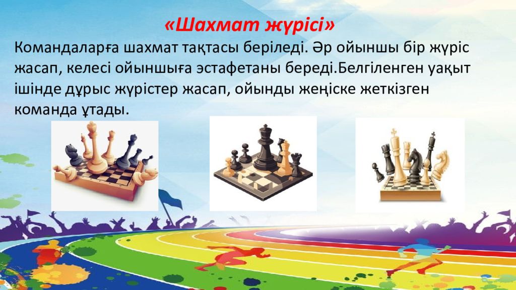 «Шахмат жүрісі » Командаларға шахмат тақтасы беріледі. Әр ойыншы бір жүріс жасап, келесі ойыншыға эстафетаны береді.Белгіленген уақыт ішінде дұрыс жүрістер жасап, ойынды жеңіске жеткізген команда ұтады.