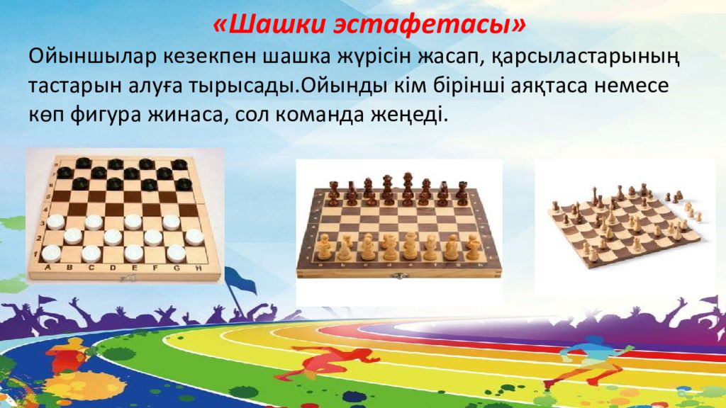 «Шашки эстафетасы » Ойыншылар кезекпен шашка жүрісін жасап, қарсыластарының тастарын алуға тырысады.Ойынды кім бірінші аяқтаса немесе көп фигура жинаса, сол команда жеңеді.