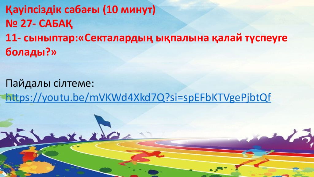 Қауіпсіздік сабағы (10 минут) № 27- САБАҚ 11- сыныптар :« Секталардың ықпалына қалай түспеуге болады ?» Пайдалы сілтеме : https://youtu.be/mVKWd4Xkd7Q?si=spEFbKTVgePjbtQf