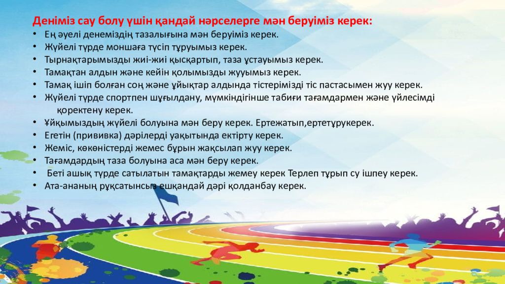 Деніміз сау болу үшін қандай нәрселерге мән беруіміз керек: Ең әуелі денеміздің тазалығына мән беруіміз керек. Жүйелі түрде моншаға түсіп тұруымыз керек. Тырнақтарымызды жиі-жиі қысқартып, таза ұстауымыз керек. Тамақтан алдын және кейін қолымызды жууымыз керек. Тамақ ішіп болған соң және ұйықтар алдында тістерімізді тіс пастасымен жуу керек. Жүйелі түрде спортпен шұғылдану, мүмкіндігінше табиғи тағамдармен және үйлесімді қоректену керек. Ұйқымыздың жүйелі болуына мән беру керек. Ертежатып,ертетұрукерек. Егетін (прививка) дәрілерді уақытында ектірту керек. Жеміс, көкөністерді жемес бұрын жақсылап жуу керек. Тағамдардың таза болуына аса мән беру керек. Беті ашық түрде сатылатын тамақтарды жемеу керек Терлеп тұрып су ішпеу керек. Ата-ананың рұқсатынсыз ешқандай дәрі қолданбау керек.