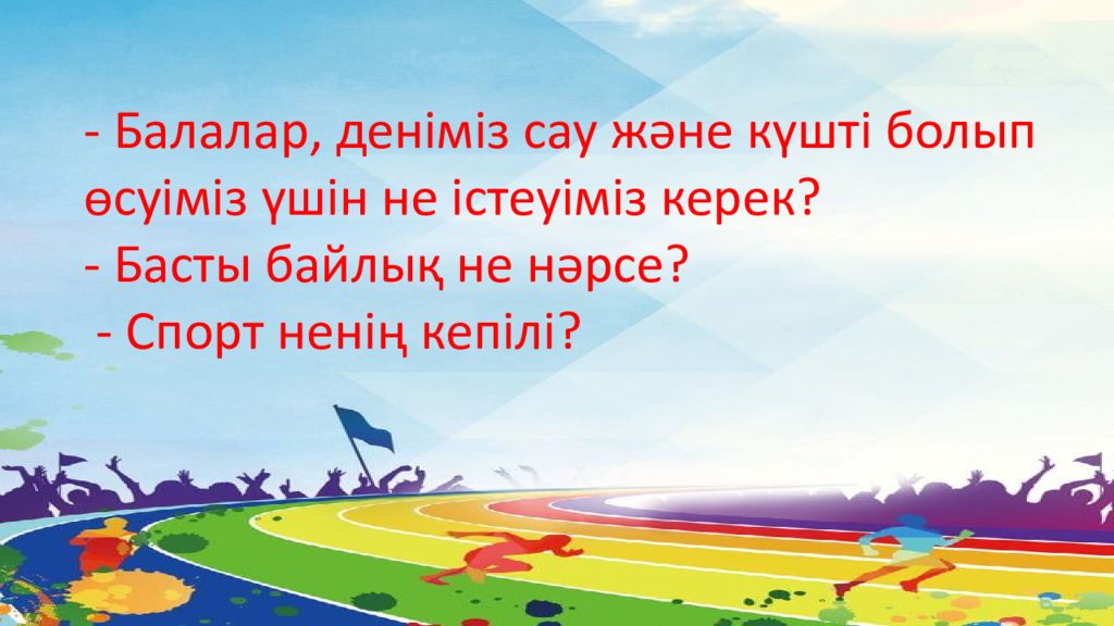 - Балалар, деніміз сау және күшті болып өсуіміз үшін не істеуіміз керек? - Басты байлық не нәрсе ? - Спорт ненің кепілі ?